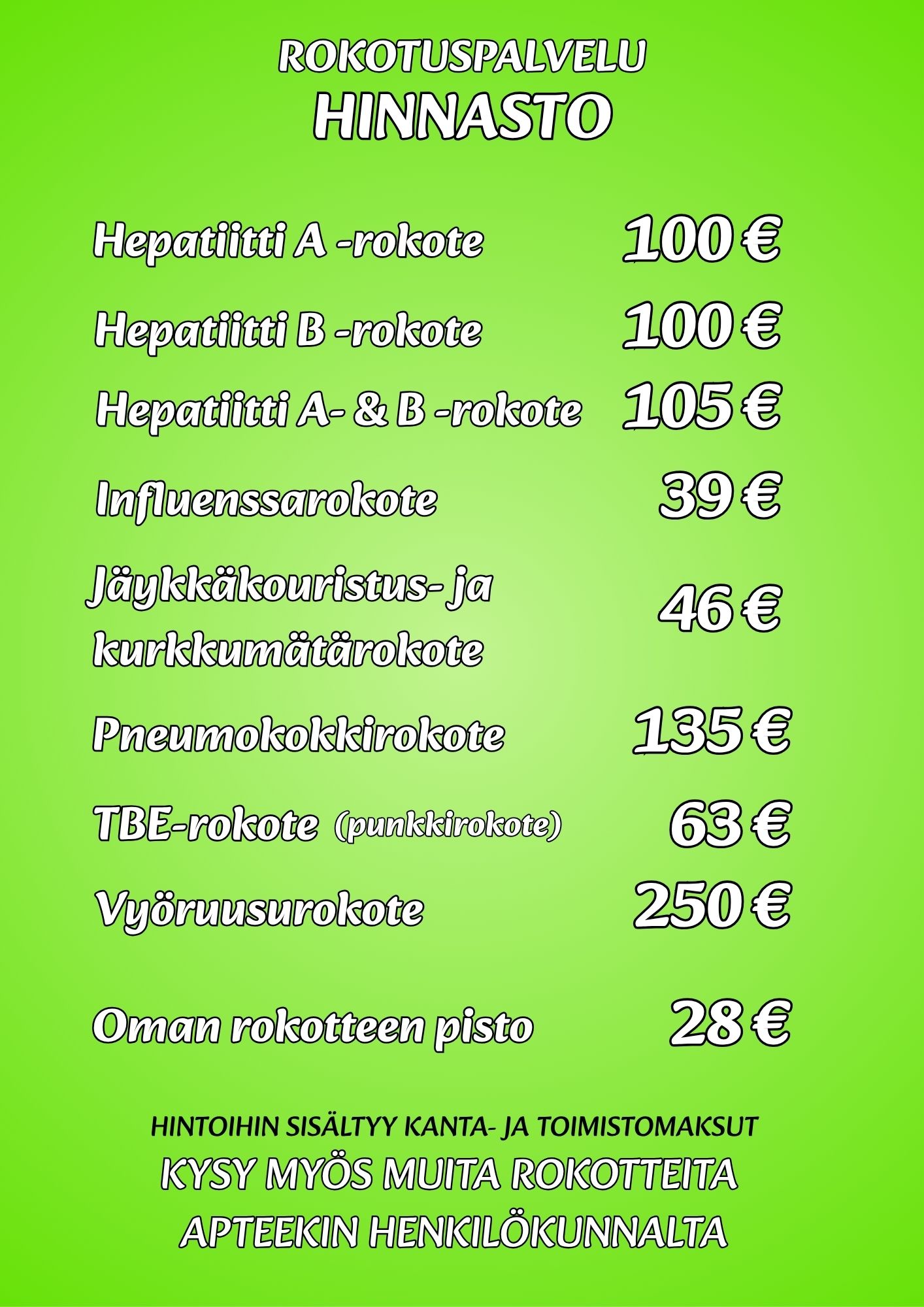 Rokotuspalvelu on avoinna Voikkaan apteekissa ja Jaalan sivuapteekissa. Rokotepisteellämme voit ottaa yleisimmät tarvitsemasi rokotukset kätevästi apteekkikäynnin yhteydessä. Rokotuksia varten et tarvitse reseptiä.